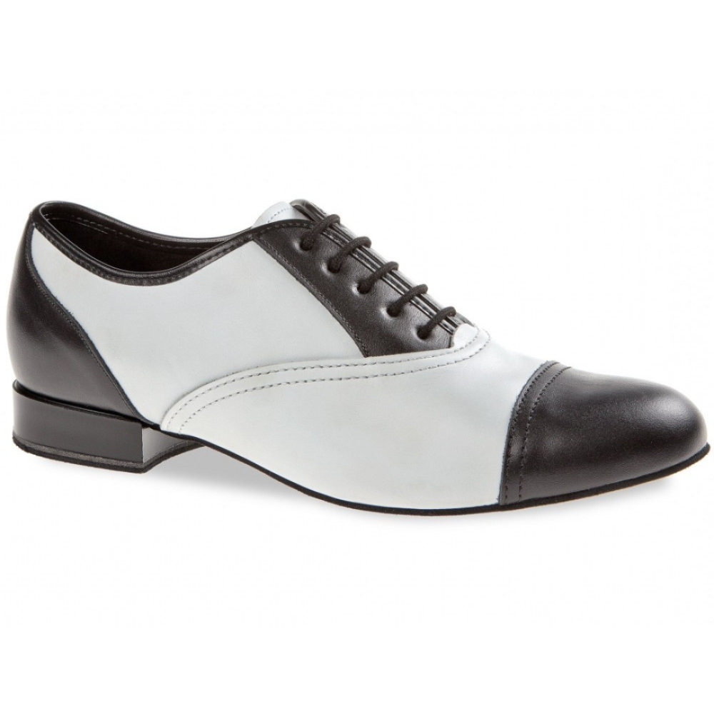 Pánské taneční boty Mod. 077 Diamant Vyrobené v Německu, ručně vyráběné v klasickém oxfordském designu s černou špičkou a uzavřeným šněrováním s 5 otvory. Tato taneční obuv je vyrobena v šířce G (normální) se standardním podpatkem absorbujícím nárazy. Jako vnitřní podšívka je prodyšné, antibakteriální a vlhkost absorbující mikrovlákno z prémiové italské produkce. Měkká kůže z Itálie se používá jako svršek v kombinaci černé kůže napa v kombinaci s bílou nappa kůží.