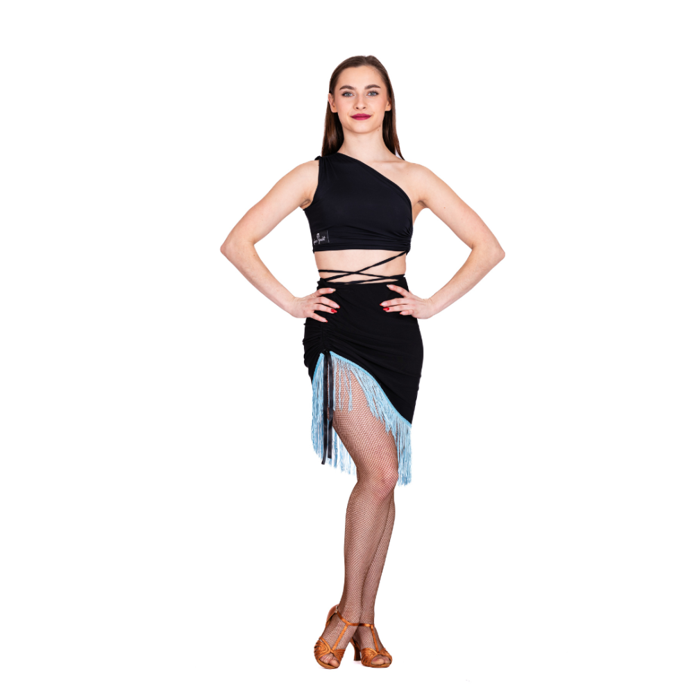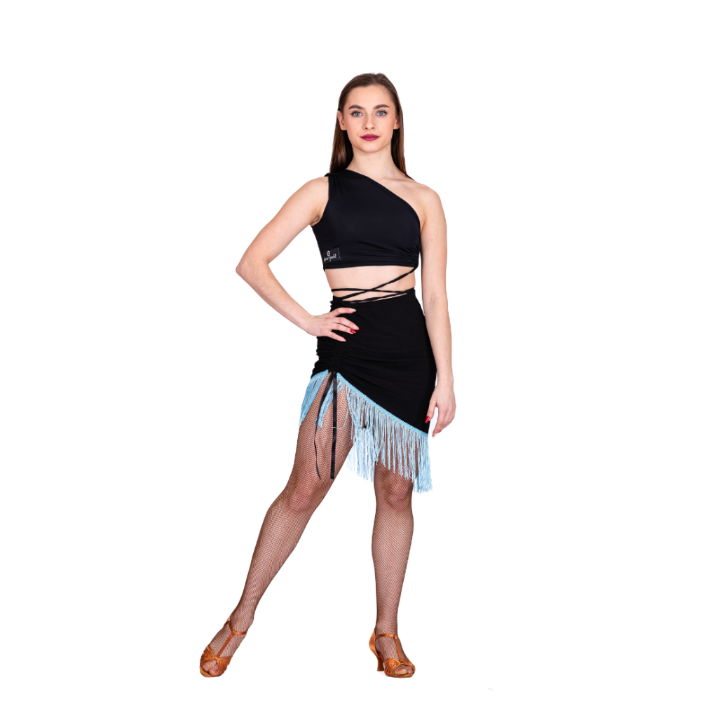 Tréninková krátká sukně s třásněmi na LAT. Třásně jsou ve dvou řadách, kde jedna je černá a druhá je barevná. Sukně je naší vlastní výroby dance-pOint, proto pokud není barevná kombinace skladem můžeme ji velice rychle vyrobit.
