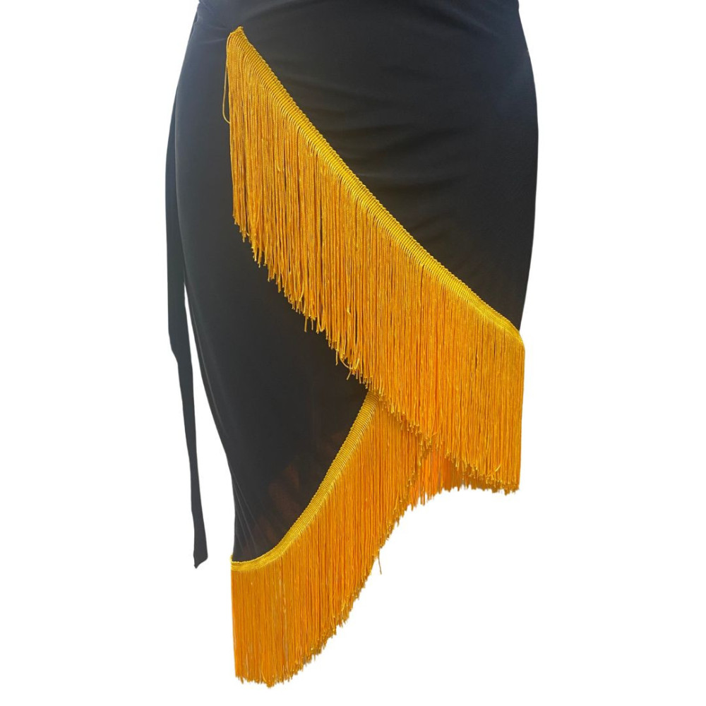 Tréninková krátká sukně s třásněmi na LAT. Třásně jsou ve dvou řadách, kde jedna je černá a druhá je barevná. Sukně je naší vlastní výroby dance-pOint, proto pokud není barevná kombinace skladem můžeme ji velice rychle vyrobit.