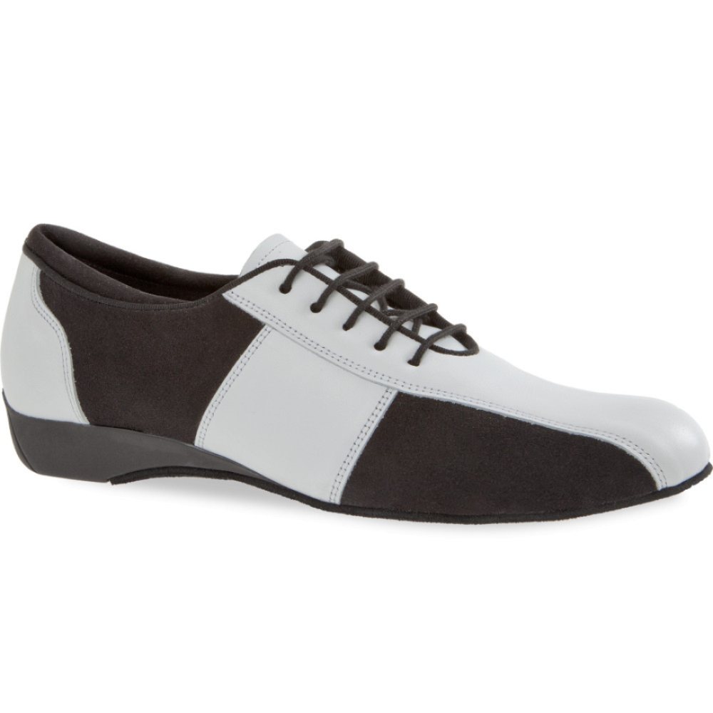 Pánská taneční obuv pro společenské tenisky, model 143 Diamant Vyrobeno v Německu, ručně vyrobeno ve sportovním designu salsy s širokým šněrováním s 5 otvory a polstrovaným okrajem paty. Tato taneční obuv je vyrobena v šířce H (pohodlná) s klínovým podpatkem absorbujícím nárazy 2,5 cm a podešví z průběžné chromované kůže s běhounem na gumové patě. Jako vnitřní podšívka je prodyšné, antibakteriální a vlhkost absorbující mikrovlákno z prémiové italské produkce. Pro svršek z bílé kůže napa v kombinaci s černým mikrovláknem jsou použity materiály nejvyšší kvality z Itálie.