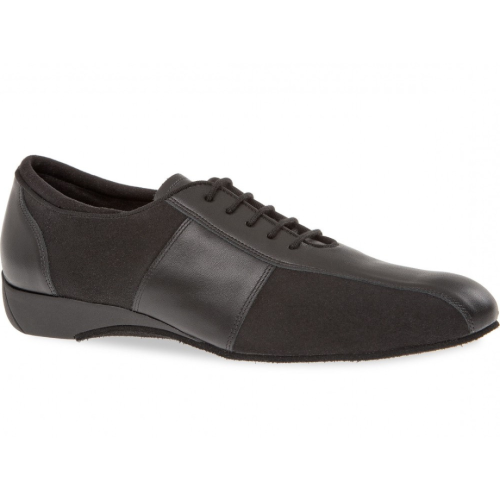 Pánská taneční obuv pro společenské tenisky, model 143 Diamant Vyrobeno v Německu, ručně vyrobeno ve sportovním designu salsy s širokým šněrováním s 5 otvory a polstrovaným okrajem paty. Tato taneční obuv je vyrobena v šířce H (pohodlná) s klínovým podpatkem absorbujícím nárazy 2,5 cm a podešví z průběžné chromované kůže přecházející na gumovou patu. Jako vnitřní podšívka je prodyšné, antibakteriální a vlhkost absorbující mikrovlákno z prémiové italské produkce. Pro svršek z červeného semiše v kombinaci s černým mikrovláknem jsou použity materiály nejvyšší kvality z Itálie.
