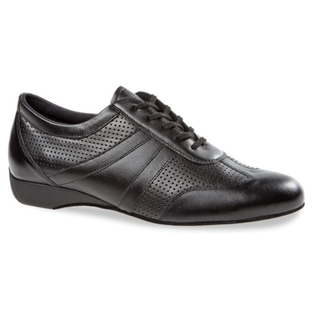 Pánské taneční tenisky, mod.133 vyrobené v Německu, ručně vyrobené ve sportovním Oxfordském designu s uzavřeným 5-ti otvorovým šněrováním a polstrovaným okrajem hřídele. Tato taneční obuv je vyrobena v šířce H (pohodlná) s 2,5 cm klínovým podpatkem absorbujícím nárazy a průběžnou podrážkou z chromové kůže s gumovým podpatkem. Jako vnitřní podšívka je použitá prodyšná, antibakteriální a vlhkost absorbující mikrovlákno z prémiové italské produkce. Pro svrchní materiály z černé kůže nappa v kombinaci s černou perforovanou kůží je použita kůže nejvyšší kvality.